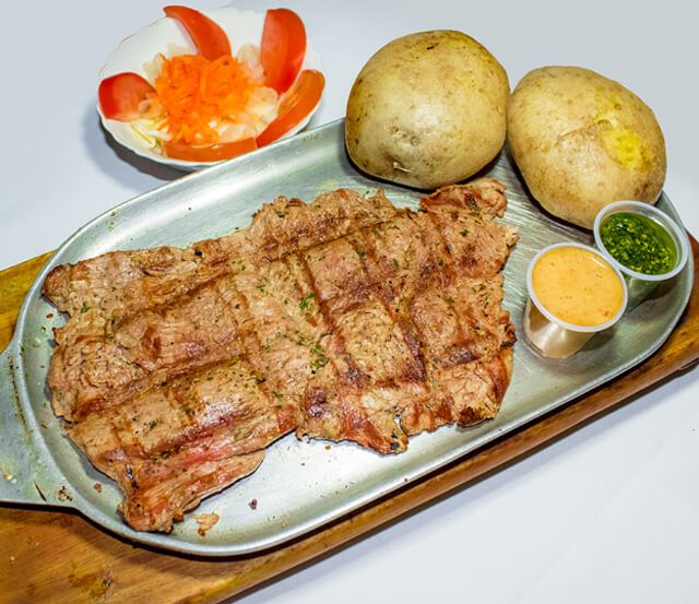 Exclusivo corte mariposa de lomo caracha a la parrilla, compañado de papa cocida, maduro frito y ensalada (Arroz Opcional)